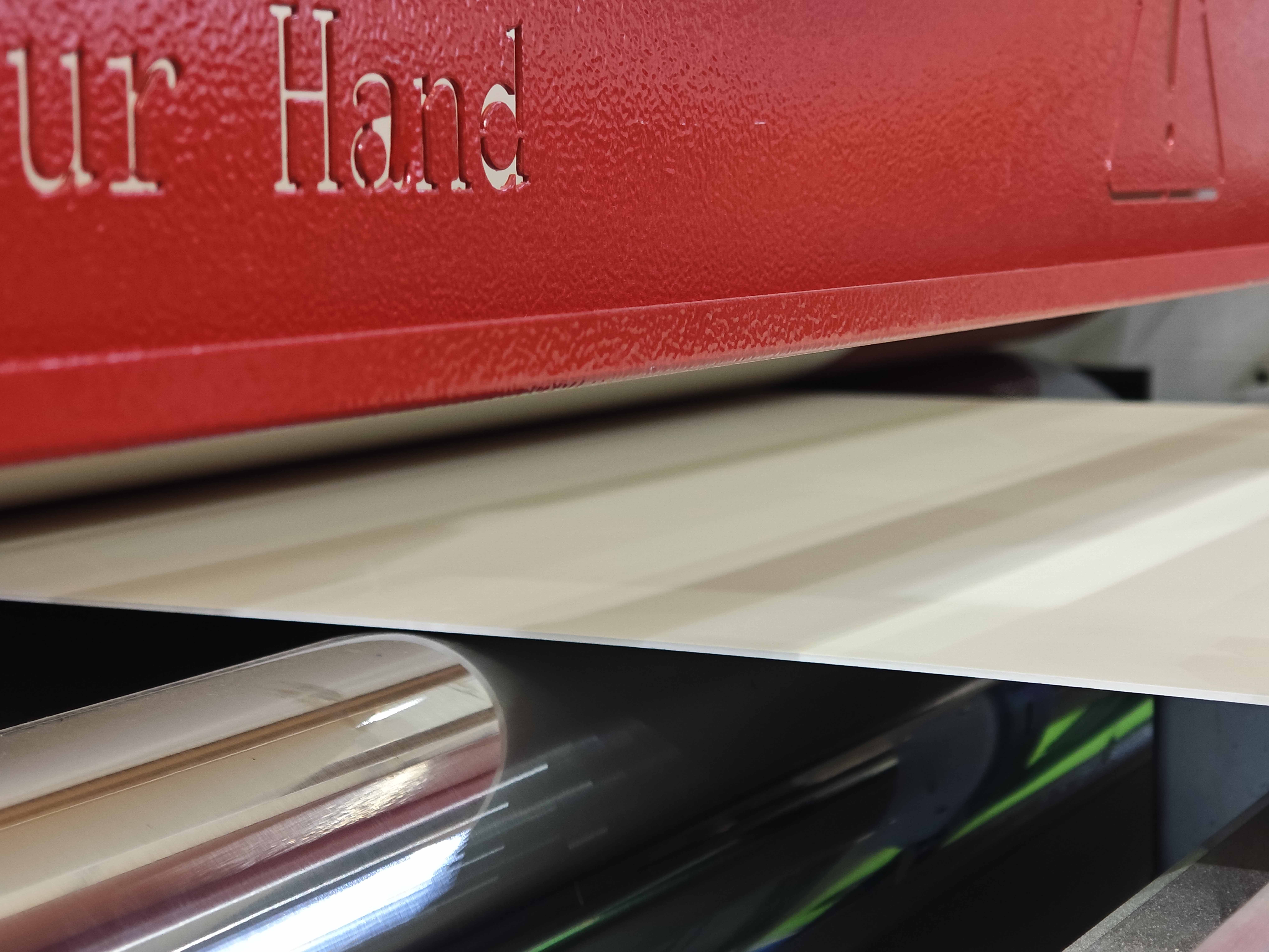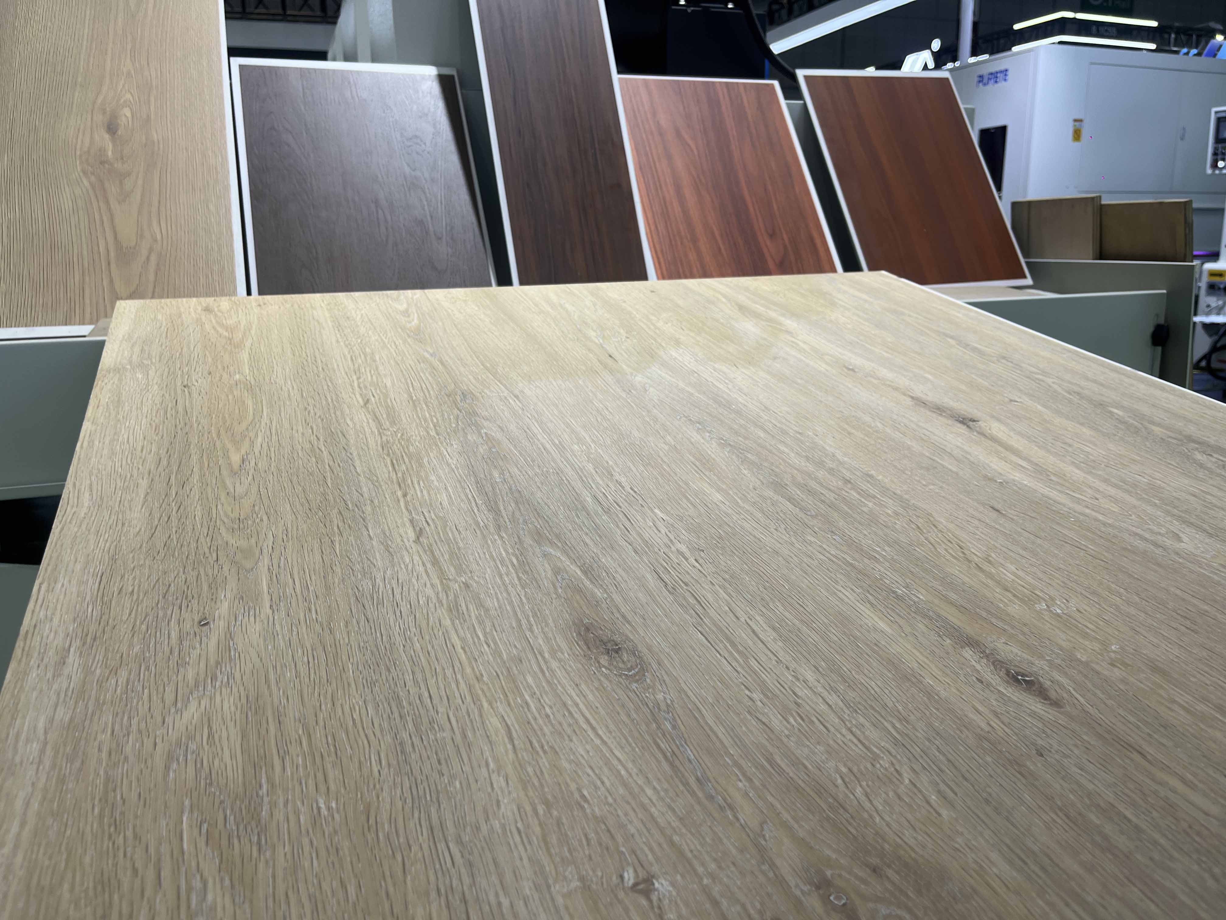 【涂飾仿真同步壓紋生產(chǎn)線】: SPC地板、PET地板可以采用設備實現(xiàn)精準定位,較傳統(tǒng)工藝提升5倍,圖案和紋理的天然仿真還原度達90%以上,以極低的成本,復刻實木地板的質感與紋理,產(chǎn)品品質不變,減少設備的投入,快速占領市場。